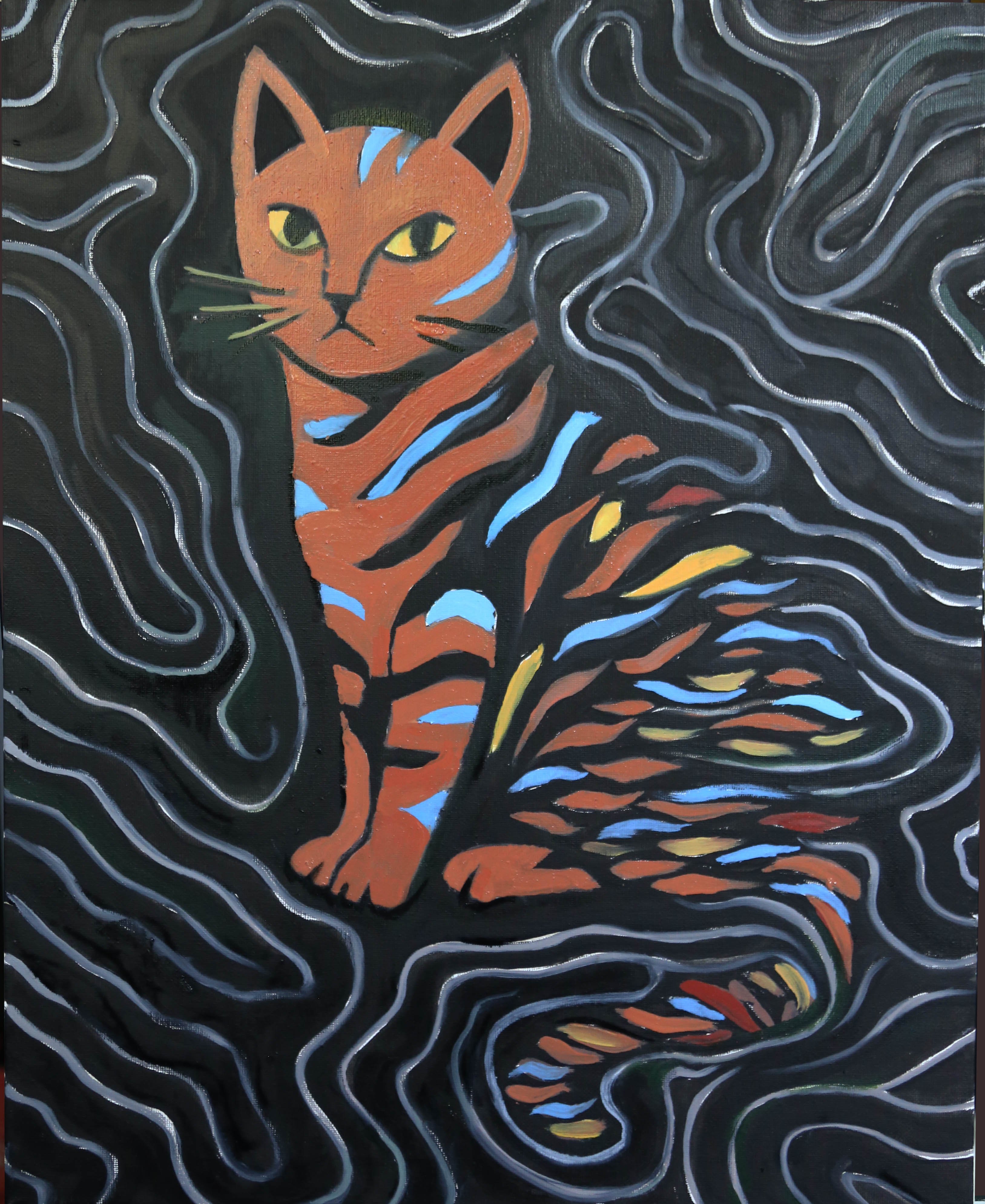 Кот Шрёдингера, 2025 холст, масло, 40 х 50 см — исчезающий кот символизирует известный мысленный эксперимент, показывающий странности квантовой физики. Картина создана к 100-летию квантовой физики.